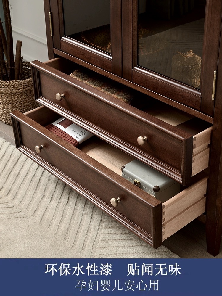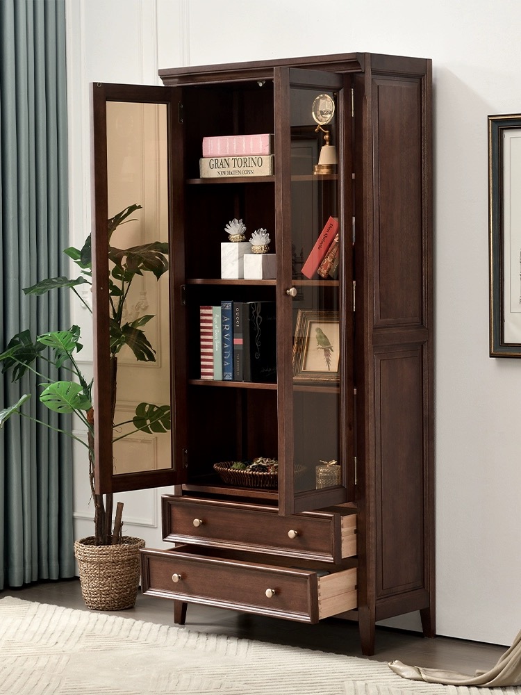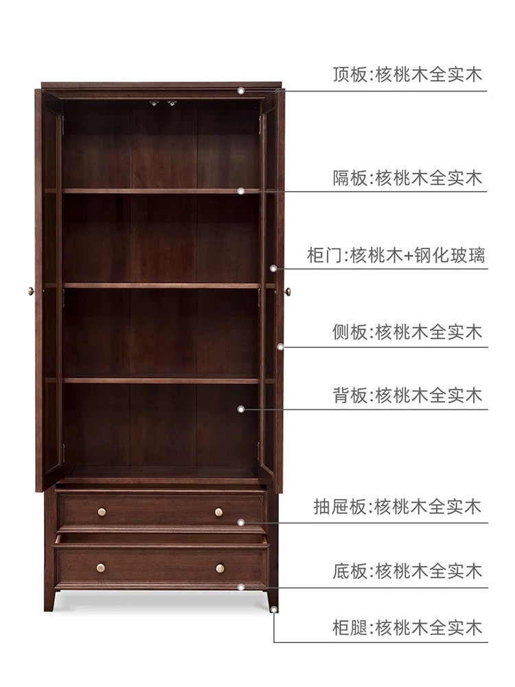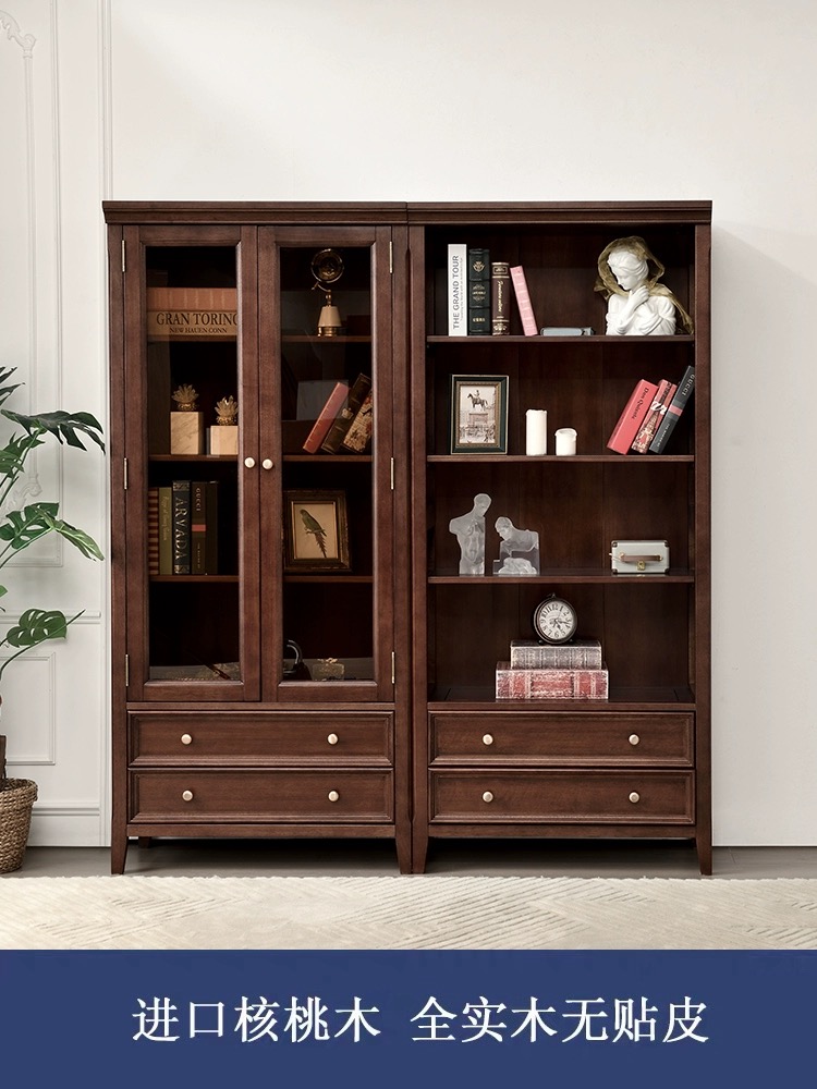 胡桃色 全实木带玻璃门书柜