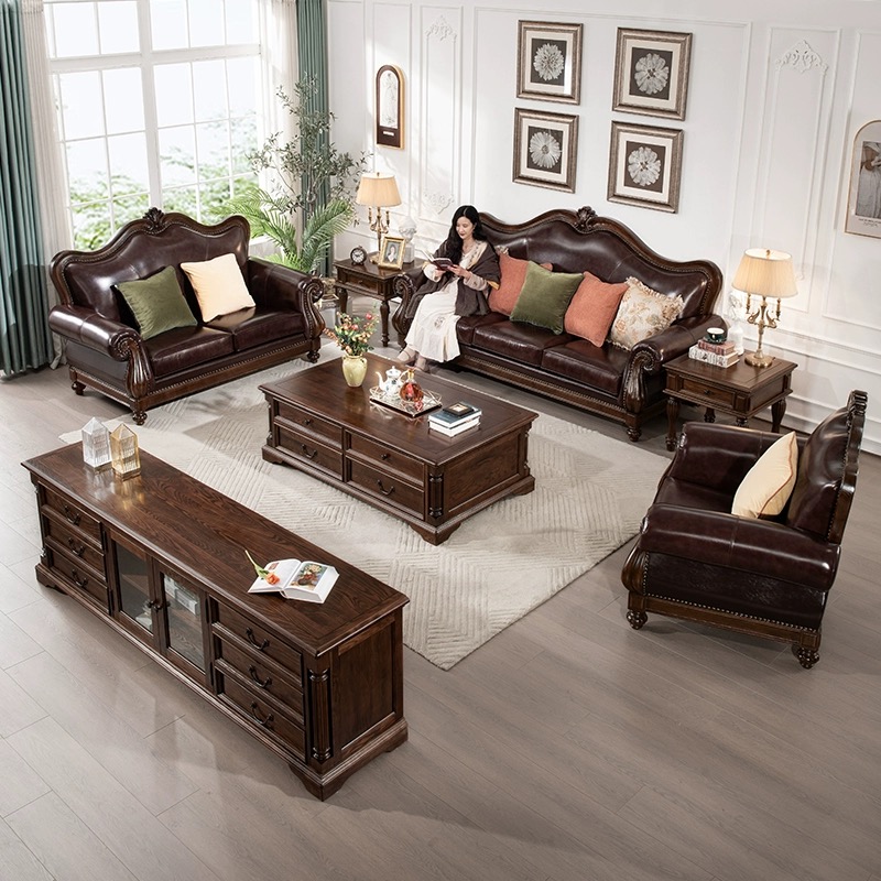 全实木真皮沙发123组合