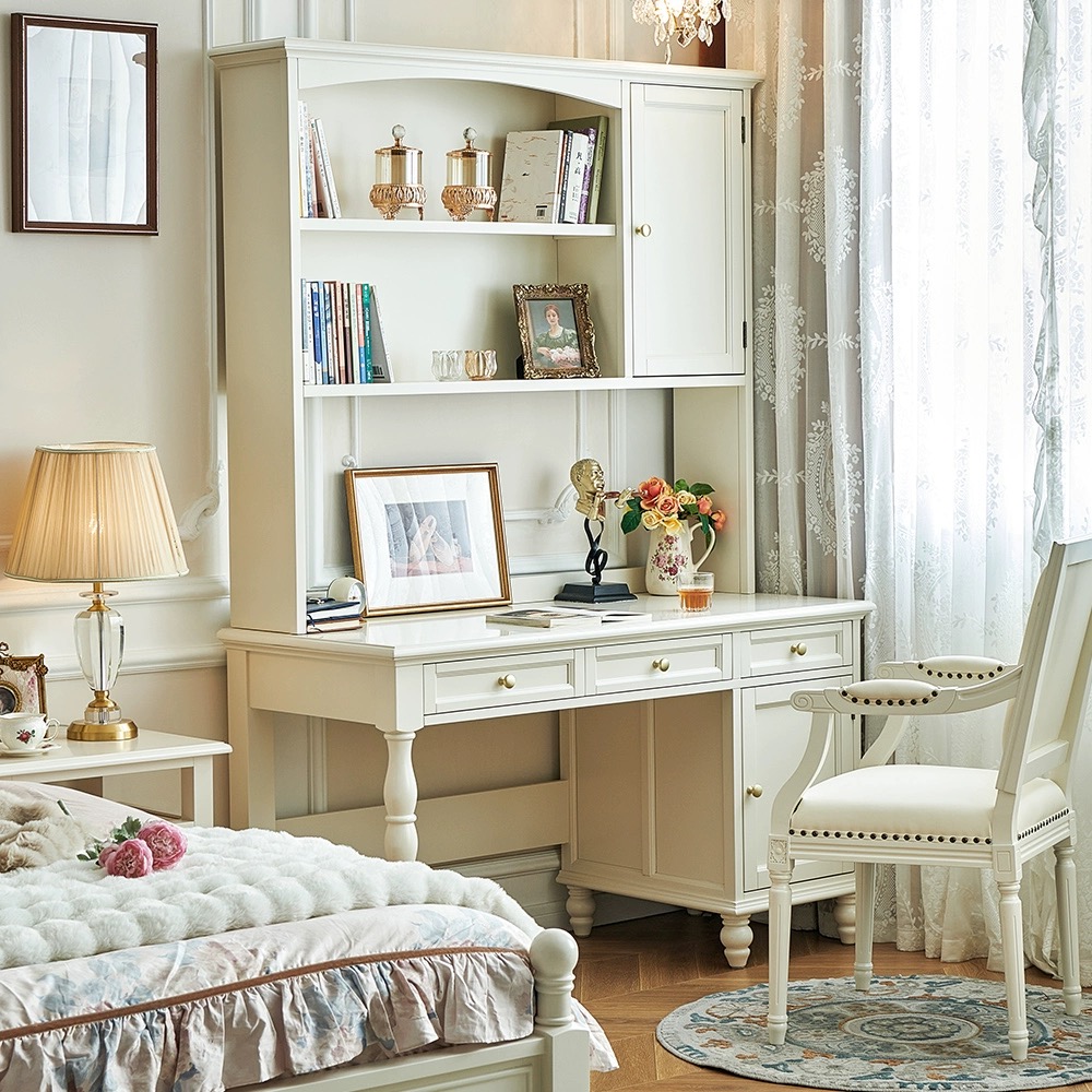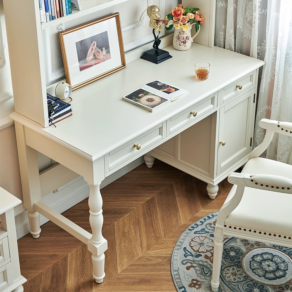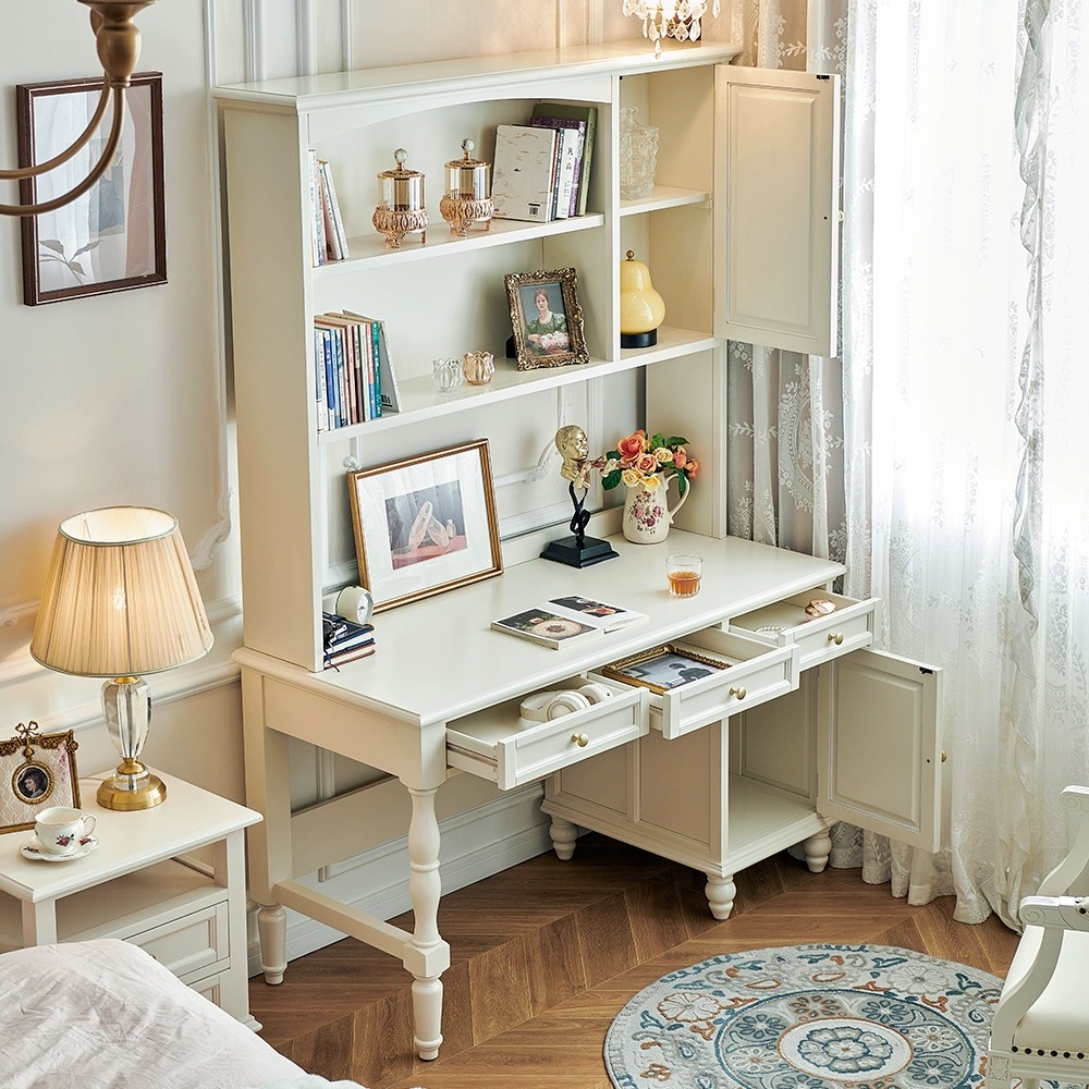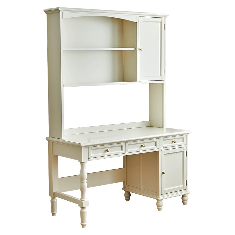 白色樱桃木全实木书桌(带书柜)