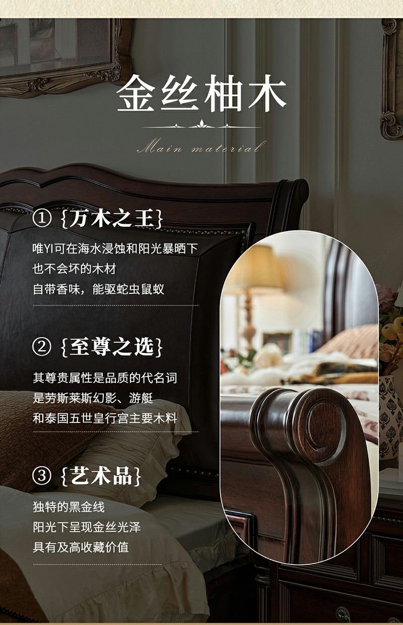 金丝柚木头层油蜡皮床+2个床头柜