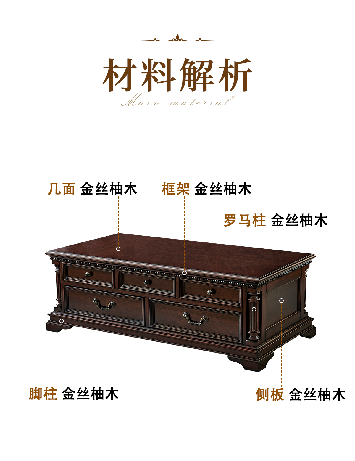 金丝柚木全实木1.65m茶几